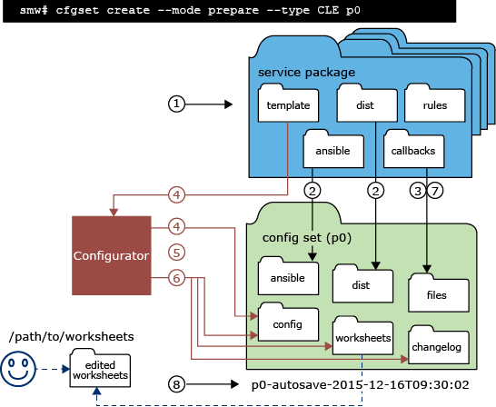 The following three figures illustrate how this eight-step process is used to create a CLE config set. They differ in how configuration data in a config set is further modified in step 5, corresponding to the three different actions: interacting with the user (modification through user interaction), not interacting with the user (no further modification), and importing worksheets (modification through bulk import of configuration worksheets). Black lines indicate cfgset actions, and red lines indicate actions taken by the configurator when invoked by cfgset.