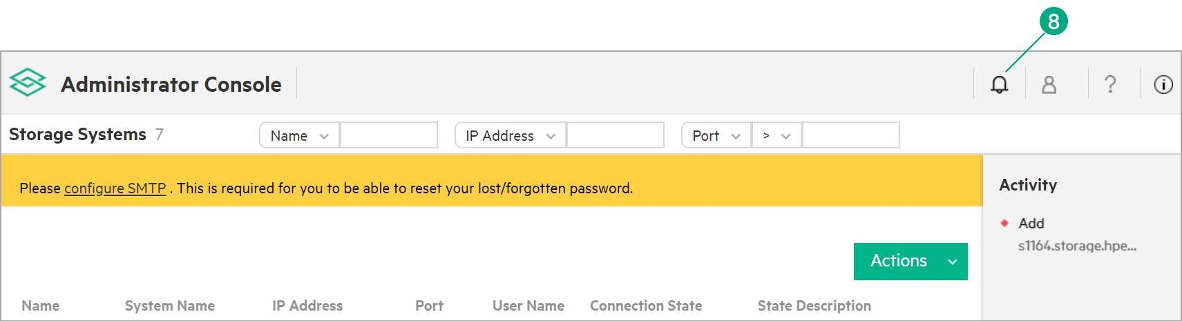 アクション(4)。アクションメニューを使用すると、管理者はストレージシステムの追加または削除、最新バージョンへのHPE SSMCアプライアンスのアップデート、および接続と証明書の管理を行うことができます。