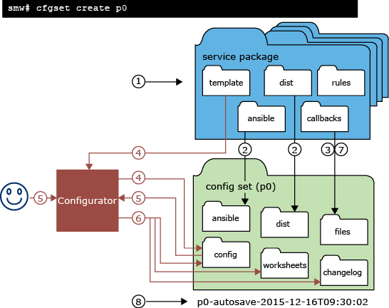 This first figure shows how the configurator creates config set templates (in the config subdirectory) from service package templates in step 4, enables the user to enter new or modify existing configuration data in step 5, and then saves the new/modified data to the config set templates and worksheets in step 6.
